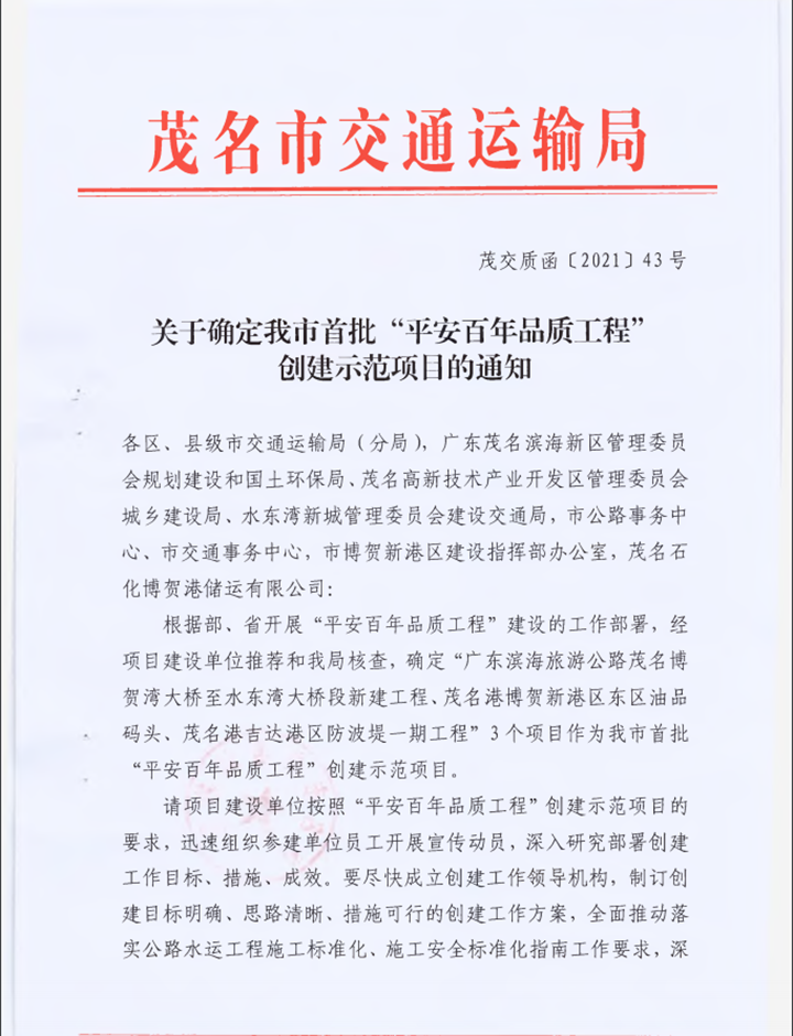 喜報(bào)!茂名港博賀新港區(qū)東區(qū)油品碼頭工程被確定為茂名市首批“平安百年品質(zhì)工程”創(chuàng)建示范項(xiàng)目