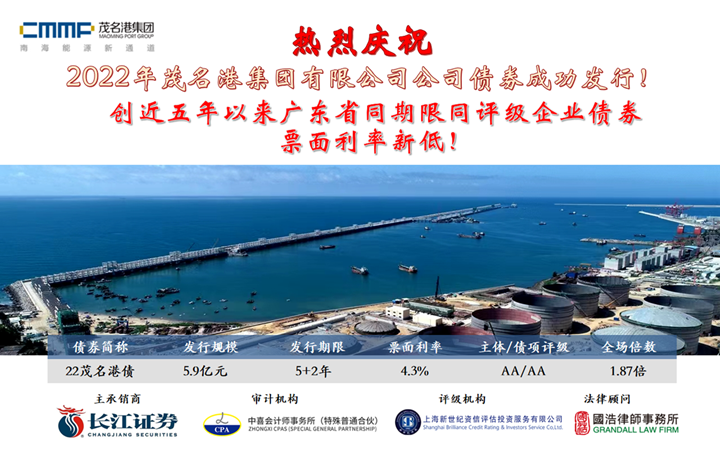 9月15日,2022年茂名港集團(tuán)有限公司公司債券成功發(fā)行,發(fā)行規(guī)模5.9億元,期限為5+2年,票面年利率4.3%,全場(chǎng)認(rèn)購倍數(shù)為1.87倍。本期債券創(chuàng)下票面利率新突破:創(chuàng)近五年以來全國同期限同評(píng)級(jí)企業(yè)債券第三低、廣東省同期限同評(píng)級(jí)企業(yè)債券票面利率新低! 在兩小時(shí)的簿記中,茂名港集團(tuán)公司債券得到多家金融機(jī)構(gòu)爭(zhēng)先認(rèn)購,使得本期公司債券利率一路走低,由4.8%降至4.3%,最終簿記當(dāng)天參與投標(biāo)的投資機(jī)構(gòu)超過20家,投標(biāo)認(rèn)購資金高達(dá)11.06億元。其中,14家投資機(jī)構(gòu)中標(biāo),發(fā)行票面利率為4.3%,為集團(tuán)節(jié)省了2095.32萬元財(cái)務(wù)成本。