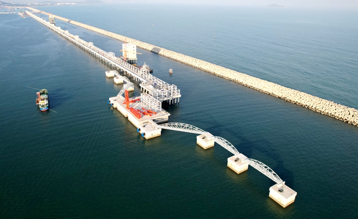茂名港博賀新港區(qū)東區(qū)油品碼頭工程位于博賀新港區(qū)東防波堤內(nèi)側(cè),規(guī)劃建設(shè)1座10萬噸級成品油碼頭泊位和4.384km公共管廊,設(shè)計(jì)吞吐能力890萬噸/年。其中,碼頭泊位由1個(gè)工作平臺、2個(gè)靠船墩及6個(gè)系纜墩組成,靠船墩和系纜墩均靠人行鋼聯(lián)橋連接,共設(shè)六座人行鋼聯(lián)橋。項(xiàng)目采用的鋼聯(lián)橋主要規(guī)格分為兩種,為27.8m和41.7m跨型式,最大重量達(dá)33.3噸。鋼聯(lián)橋?yàn)楣敖Y(jié)構(gòu),能夠充分利用材料的強(qiáng)度,具有自重輕、材料強(qiáng)度高、抗拉性能好、承載效率高、造型美觀、施工安裝方便等優(yōu)點(diǎn)。鋼聯(lián)橋是碼頭工程的重要組成部分,是聯(lián)通公共管廊、碼頭平臺、靠船墩和系纜墩的唯一通道。鋼聯(lián)橋的安裝完成,標(biāo)志著茂名港博賀新港區(qū)東區(qū)油品碼頭項(xiàng)目標(biāo)段一碼頭工程全面完工,為全面開展上部安裝工程奠定了基礎(chǔ)!