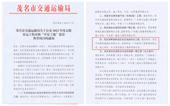 2月2日,茂名市交通運輸局下發(fā)《茂名市交通運輸局關(guān)于公布2022年度公路水運工程市級“平安工地”建設(shè)典型項目的通知》文件,對2022年度公路水運工程平安工地建設(shè)成效突出的項目進(jìn)行表彰通報。集團(tuán)建設(shè)的茂名港博賀新港區(qū)東區(qū)油品碼頭工程獲評“平安工地”稱號,這已是油品碼頭工程連續(xù)3年榮獲該項榮譽。