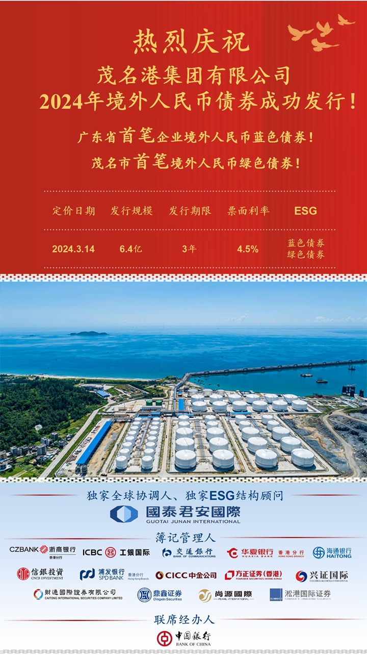 3月14日,茂名港集團(tuán)有限公司成功定價(jià)2024年境外人民幣債券,發(fā)行規(guī)模6.4億人民幣、票息4.5%。債券在香港和澳門兩地交易所上市,作為廣東省首筆企業(yè)境外藍(lán)色債券、茂名市首筆境外人民幣綠色債券,為清潔能源、綠色交通、可持續(xù)發(fā)展的新質(zhì)生產(chǎn)力等重要領(lǐng)域提供了資金支持。